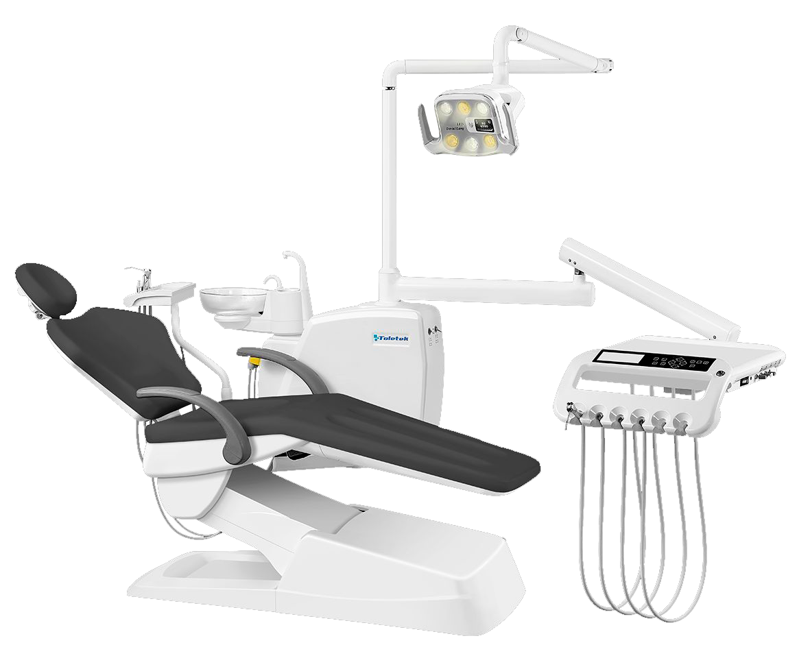 Unidad dental completamente eléctrica, equipada con lámpara operatoria de 6 LED con sensor de movimiento, escupidera giratoria y módulo para asistente con control, diseñada para facilitar el trabajo cómodo y eficiente a cuatro manos.