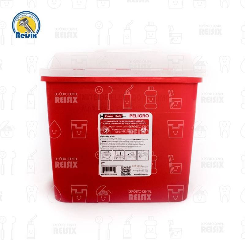 Bote rojo indicado como contenedor de residuos punzocortantes biopeligrosos con capacidad de 4L