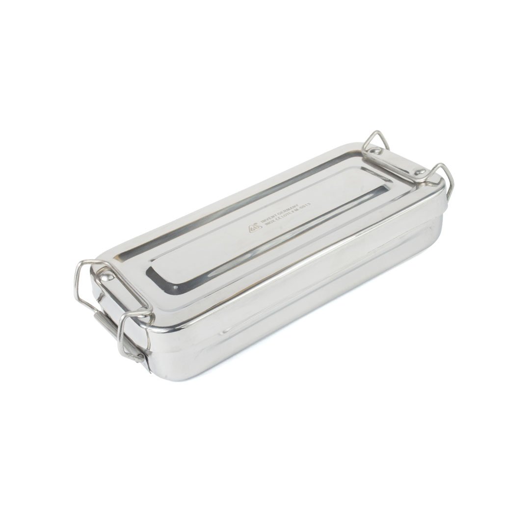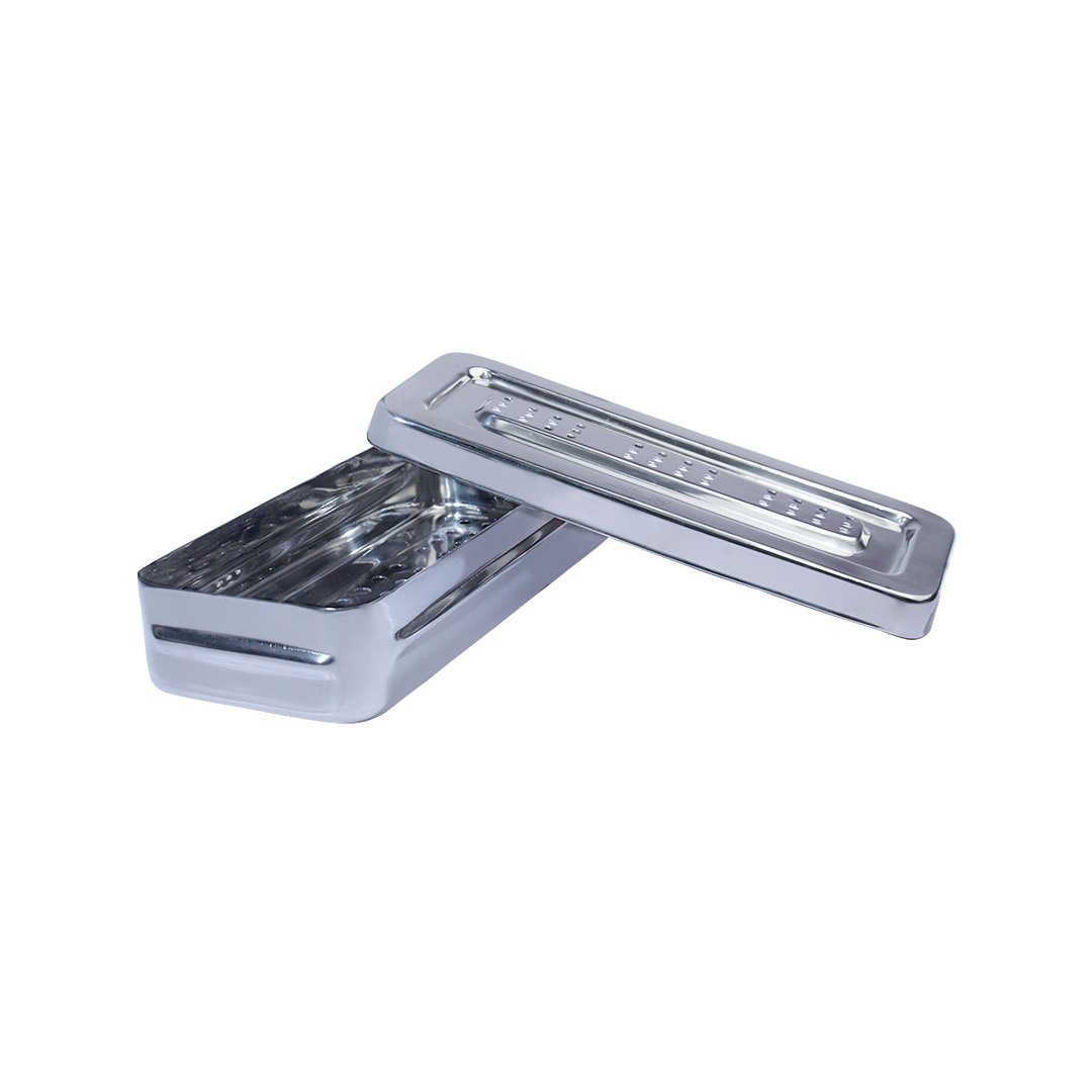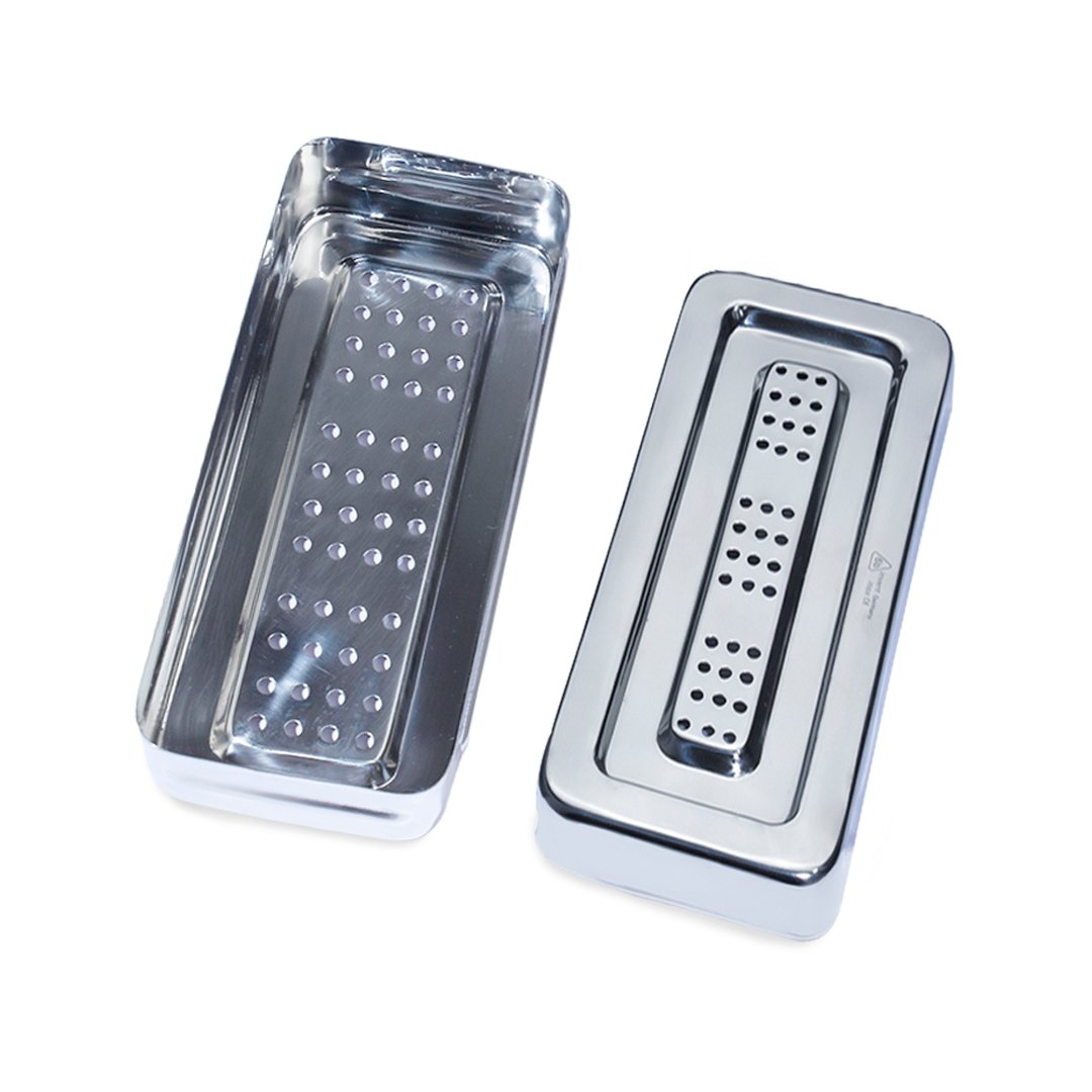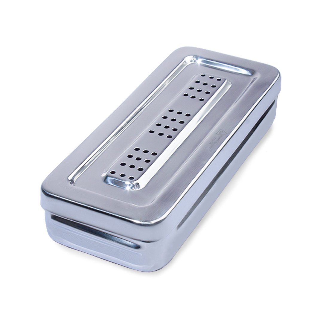 Material fabricado en acero inoxidable de alta calidad, autoclavable, perforado con tapa. Permite la esterilización o el almacenaje de los instrumentos