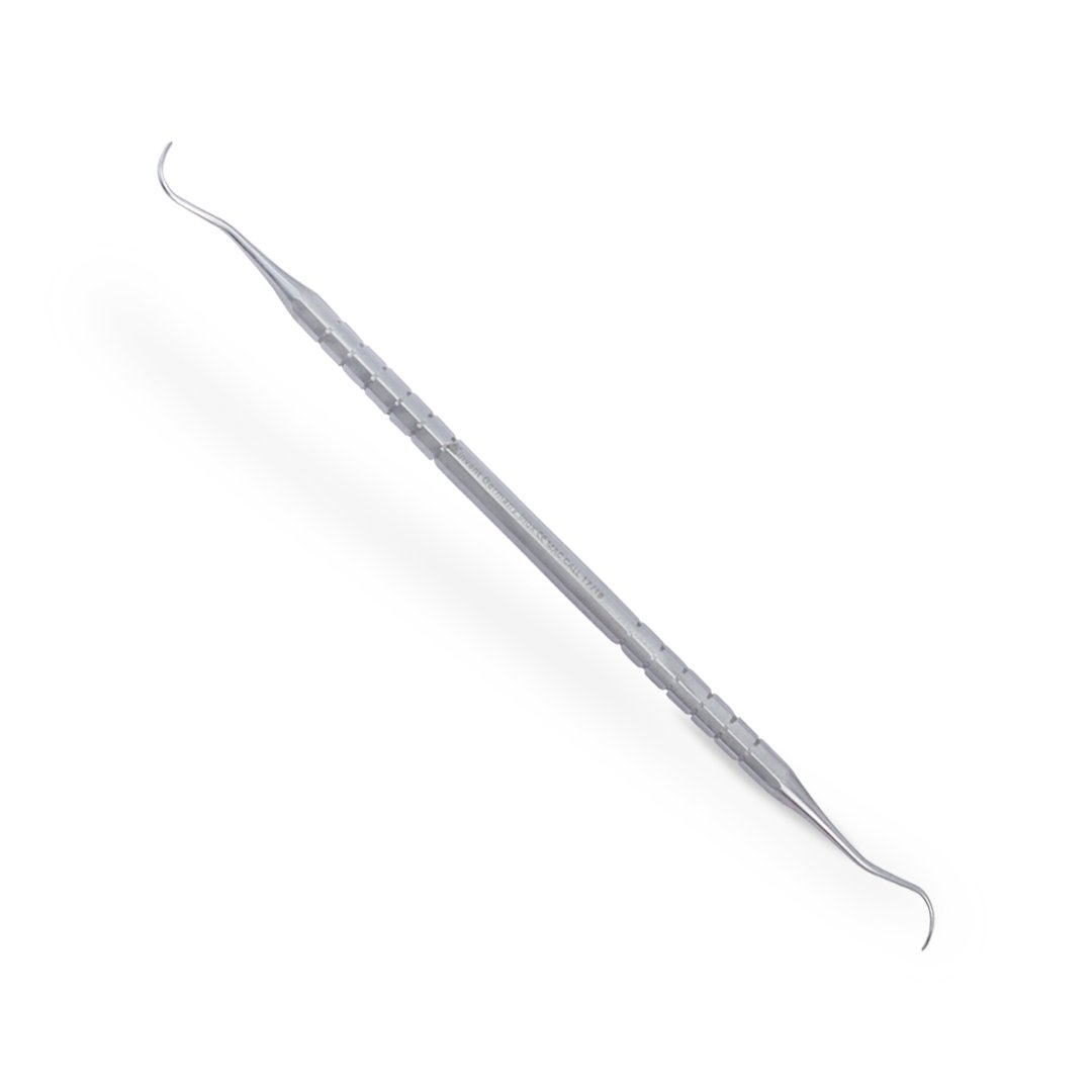Instrumental fabricado en acero inoxidable de alta calidad, autoclavable, doble punta activa con borde cortante, facilita el acceso gracias a su angulación, indicada para el raspado y alisado radicular, útil para la cara distal de los molares.
