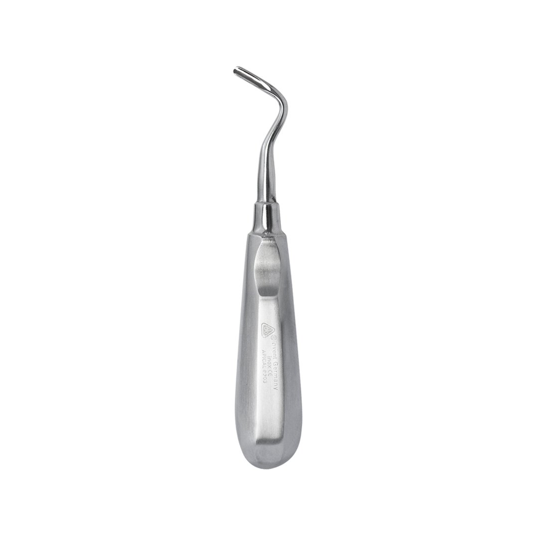 Elevador Apical 303 marca 6B, utilizado en odontología para remanencia de restos radiculares. La forma de la punta del elevador determina la función que realizará.