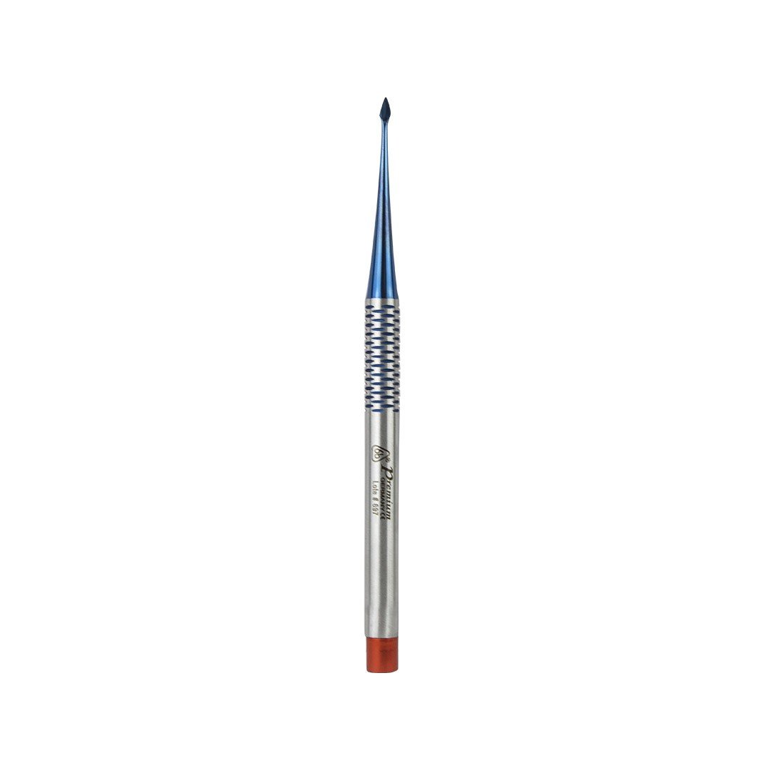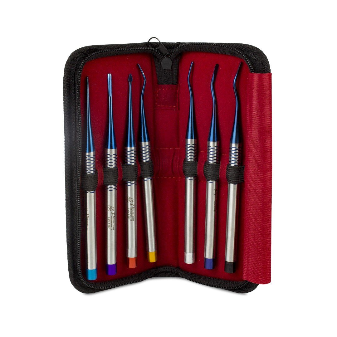 Elegante estuche con 7 elevadores atraumáticos de mango delgado de lujo línea premium 6B de acero inoxidable recubiertos de titanio azul. Excelentes para luxación antes de la extracción con fórceps, extracción de raíces o dientes impactados, dientes comprometidos, susceptibles a fracturas o en posiciones de difícil acceso.