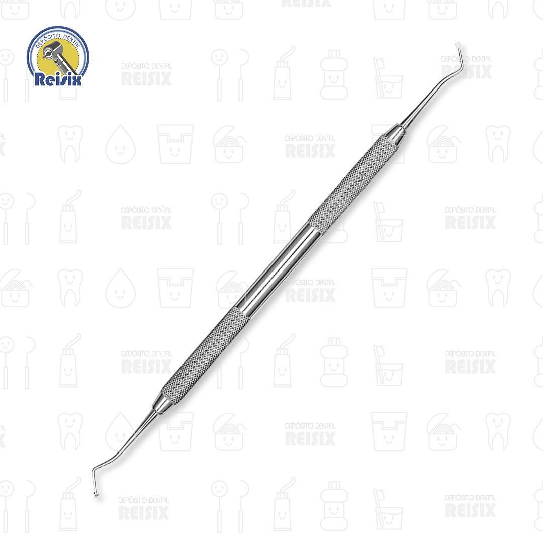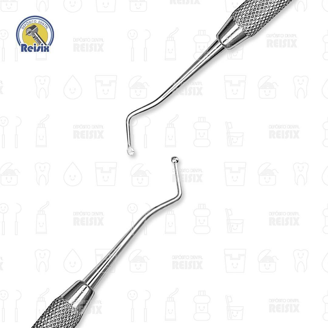 Instrumental fabricado en acero inoxidable de alta calidad, autoclavable, doble punta activa, angulada en forma de cucharilla, mango estriado antideslizante, vástago de longitud extendida para facilitar el acceso.