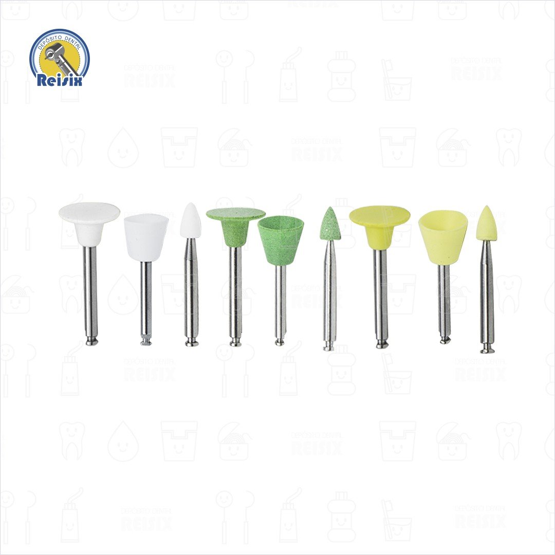 Los pulidores Jiffy son copas, discos y puntas abrasivas de goma de silicona impregnadas con carburo de silicio y partículas de óxido de aluminio, así como cepillos abrillantadores. Ez Jiffy incluye pulidores en varias formas y granulados para el acabado y pulido de resina, diseñados con vástago de contraángulo.