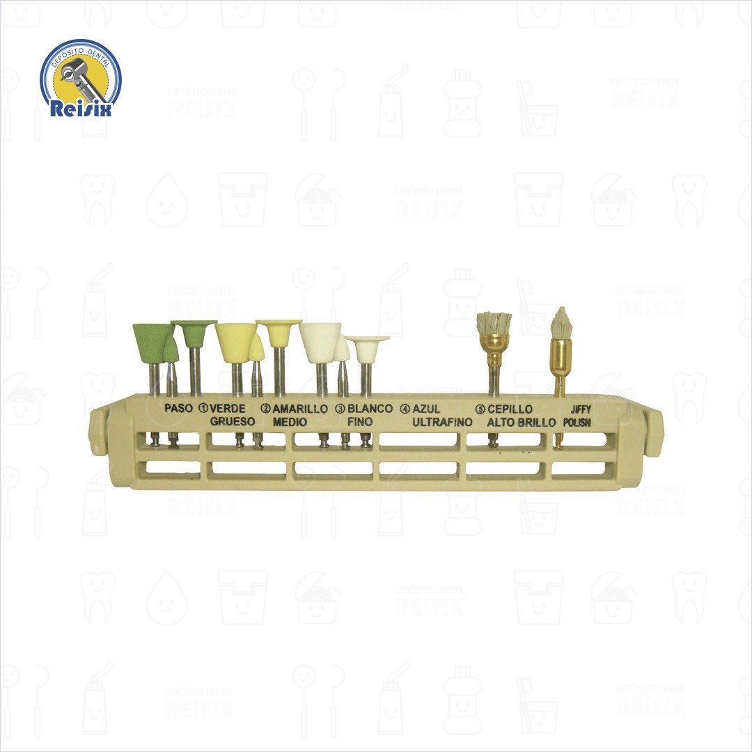 El orden de los pulidores es el siguiente: las irregularidades más pronunciadas se rebajan con los pulidores Jiffy verdes, enseguida se suavizan irregularidades menores con los pulidores Jiffy amarillos y se realiza el acabado final con los pulidores Jiffy blancos.