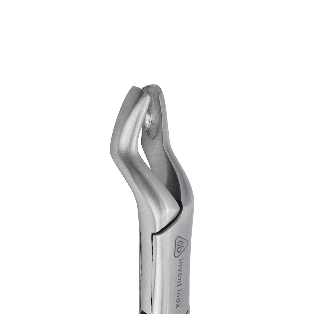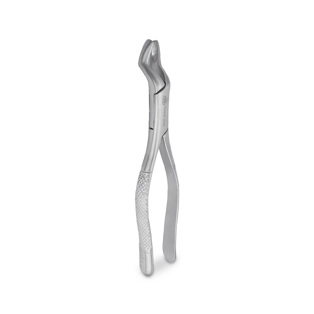 Instrumental fabricado en acero inoxidable de alta calidad, autoclavable, forma anatómica que permite una correcta prensión adaptándose al cuello del diente, actuando como palanca sujeta a la pieza dentaria, presenta estrías o texturas en la superficie para asegurar el agarre y evitar deslizamiento del diente, mediante movimientos de impulsión, laterales, y de tracción, se logra la extracción dentaria.