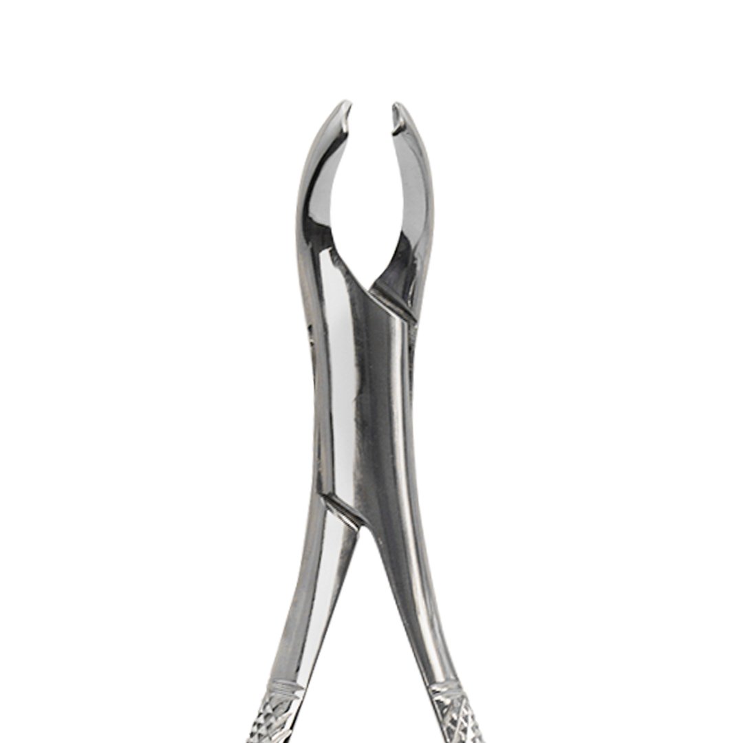 Instrumental fabricado en acero inoxidable de alta calidad, autoclavable, forma anatómica que permite una correcta prensión adaptándose al cuello del diente, actuando como palanca sujeta a la pieza dentaria, presenta estrías o texturas en la superficie para asegurar el agarre y evitar deslizamiento del diente, mediante movimientos de impulsión, laterales, y de tracción, se logra la extracción dentaria.