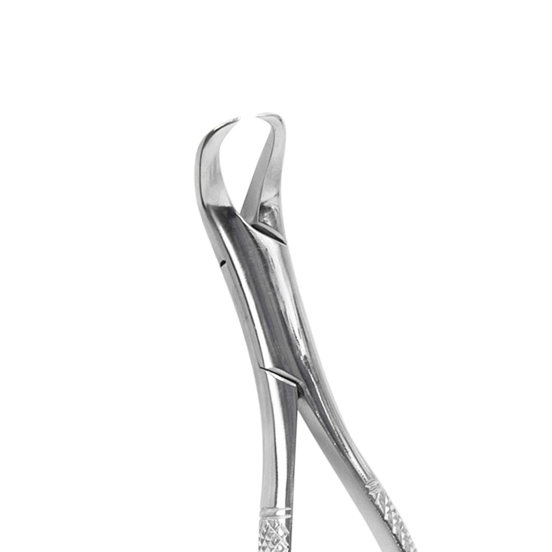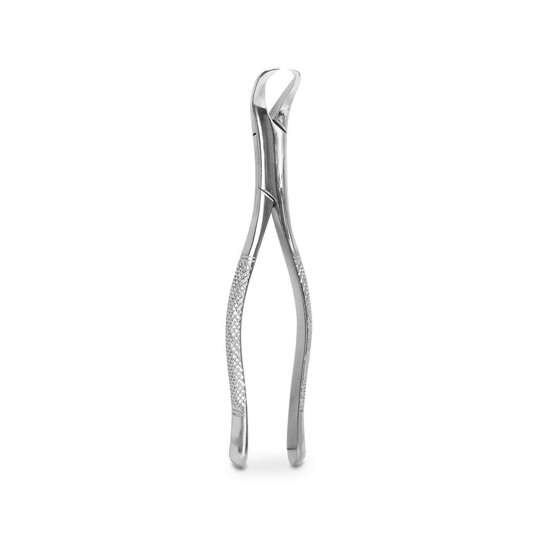 Instrumental fabricado en acero inoxidable de alta calidad, autoclavable, forma anatómica que permite una correcta prensión adaptándose al cuello del diente, actuando como palanca sujeta a la pieza dentaria, presenta estrías o texturas en la superficie para asegurar el agarre y evitar deslizamiento del diente, mediante movimientos de impulsión, laterales, y de tracción, se logra la extracción dentaria.