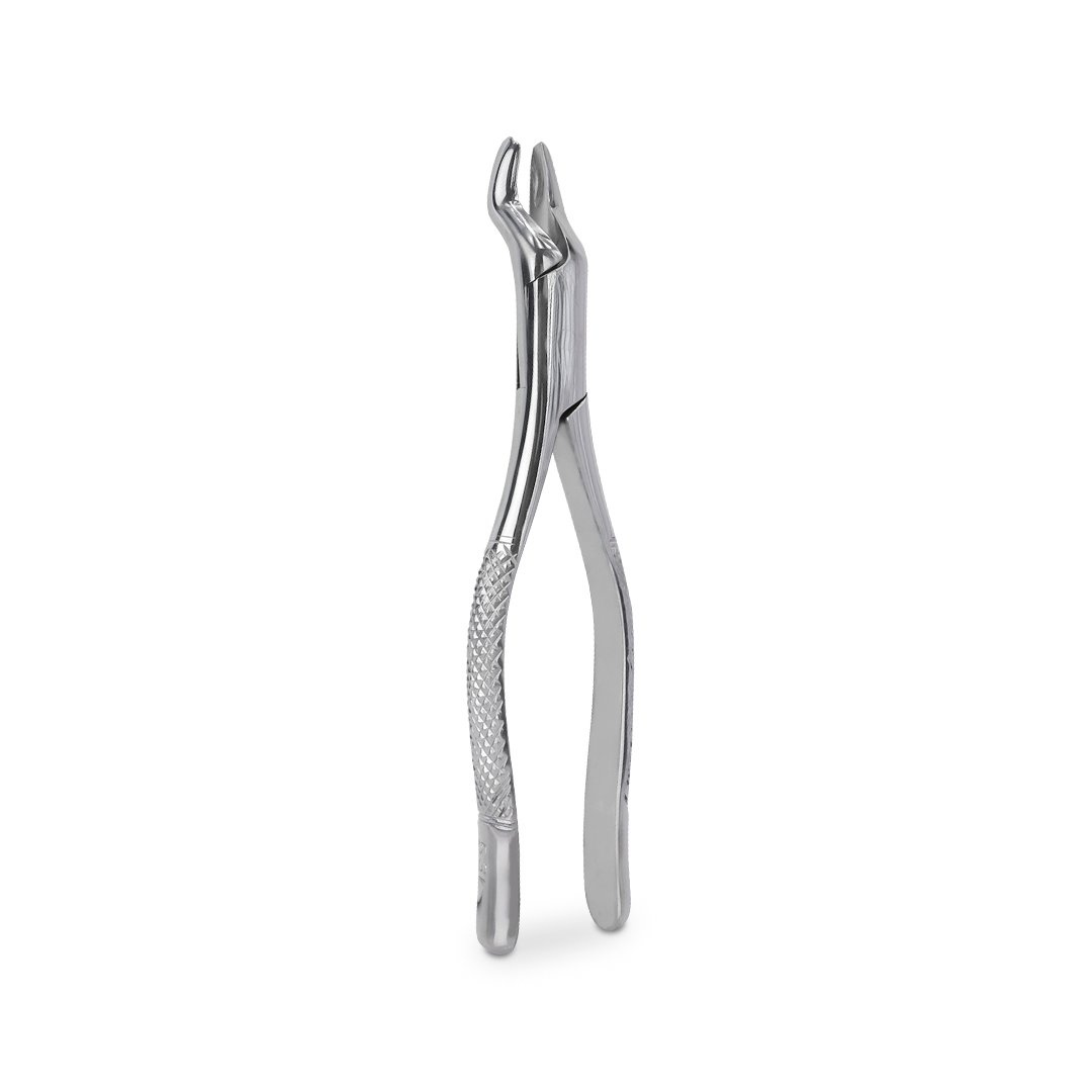 Instrumental fabricado en acero inoxidable de alta calidad, autoclavable, forma anatómica que permite una correcta prensión adaptándose al cuello del diente, actuando como palanca sujeta a la pieza dentaria, presenta estrías o texturas en la superficie para asegurar el agarre y evitar deslizamiento del diente, mediante movimientos de impulsión, laterales, y de tracción, se logra la extracción dentaria.