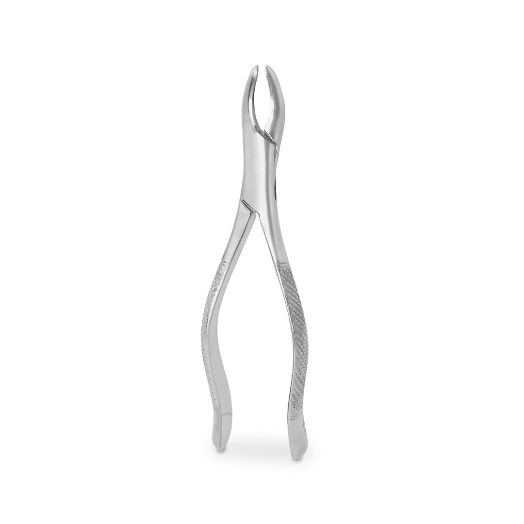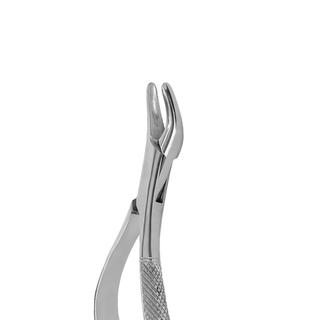 Instrumental fabricado en acero inoxidable de alta calidad, autoclavable, forma anatómica que permite una correcta prensión adaptándose al cuello del diente, actuando como palanca sujeta a la pieza dentaria, presenta estrías o texturas en la superficie para asegurar el agarre y evitar deslizamiento del diente, mediante movimientos de impulsión, laterales, y de tracción, se logra la extracción dentaria.