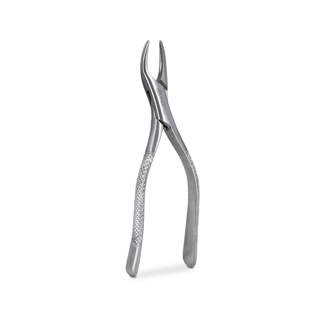 Instrumental fabricado en acero inoxidable de alta calidad, autoclavable, forma anatómica que permite una correcta prensión adaptándose al cuello del diente, actuando como palanca sujeta a la pieza dentaria, presenta estrías o texturas en la superficie para asegurar el agarre y evitar deslizamiento del diente, mediante movimientos de impulsión, laterales, y de tracción, se logra la extracción dentaria.