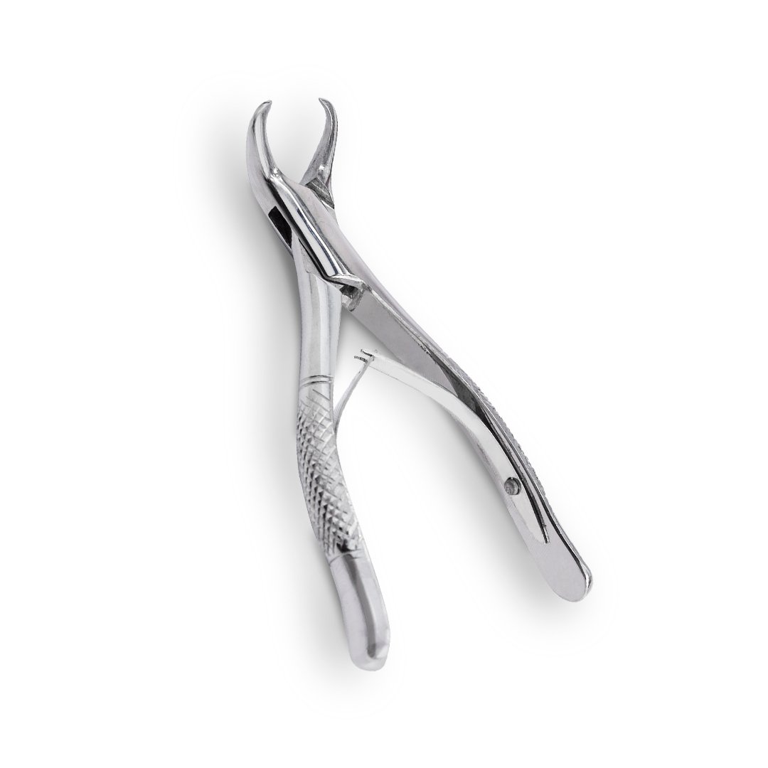 Instrumental fabricado en acero inoxidable de alta calidad, autoclavable, forma anatómica que permite una correcta prensión adaptándose al cuello del diente, actuando como palanca, sujeta a la pieza dentaria, presenta estrías o texturas en la superficie para asegurar el agarre y evitar deslizamiento del diente, mediante movimientos de impulsión, laterales, y de tracción, se logra la extracción dentaria.