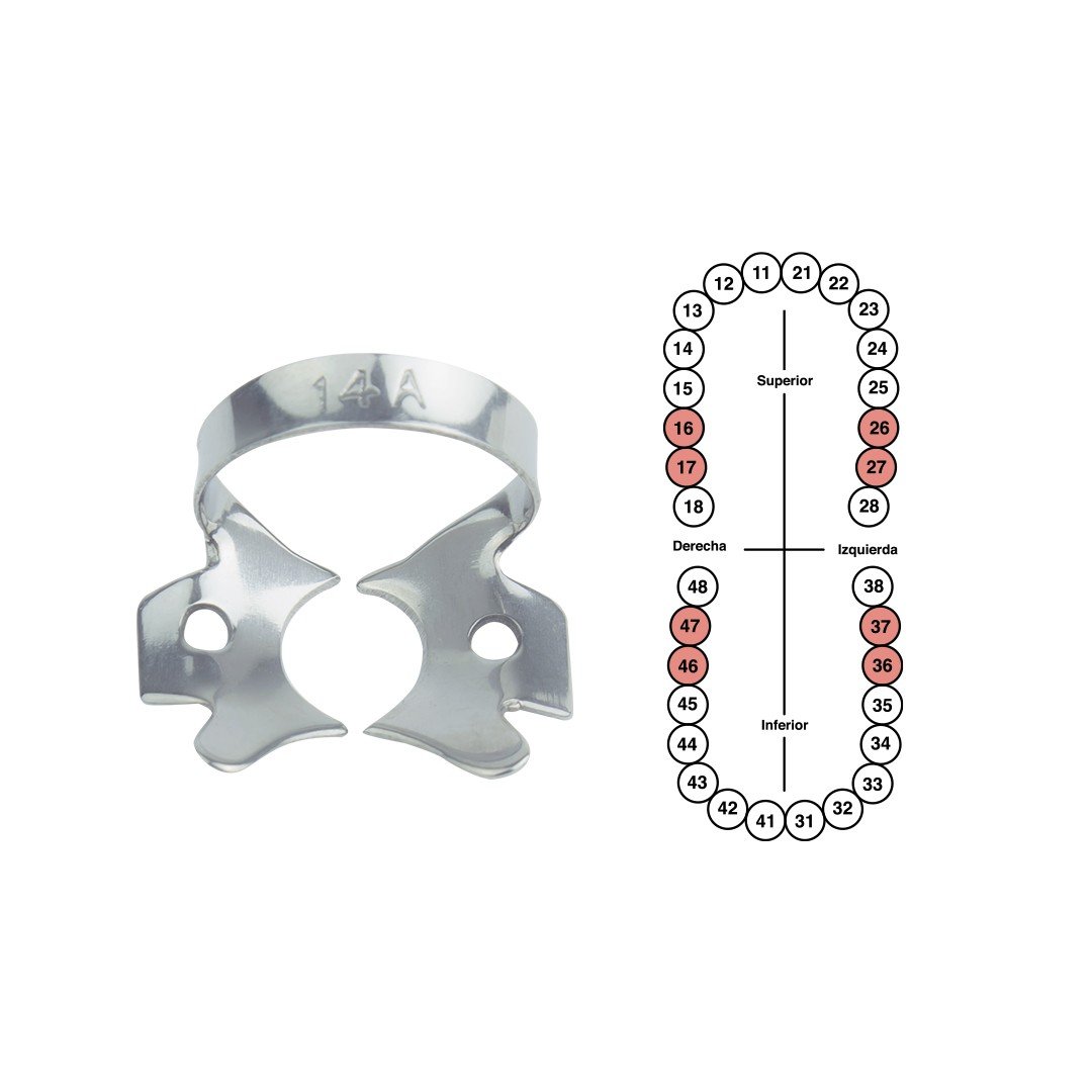 Grapa no. 14A marca 6B indicada para el aislamiento absoluto en especial en molares superiores e inferiores.