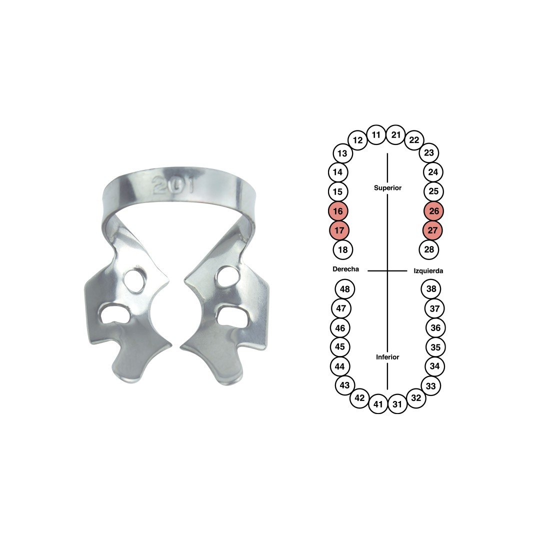 Grapa no. 201 marca 6B hecha de acero inoxidable, con forma anatómica para el diente indicado.