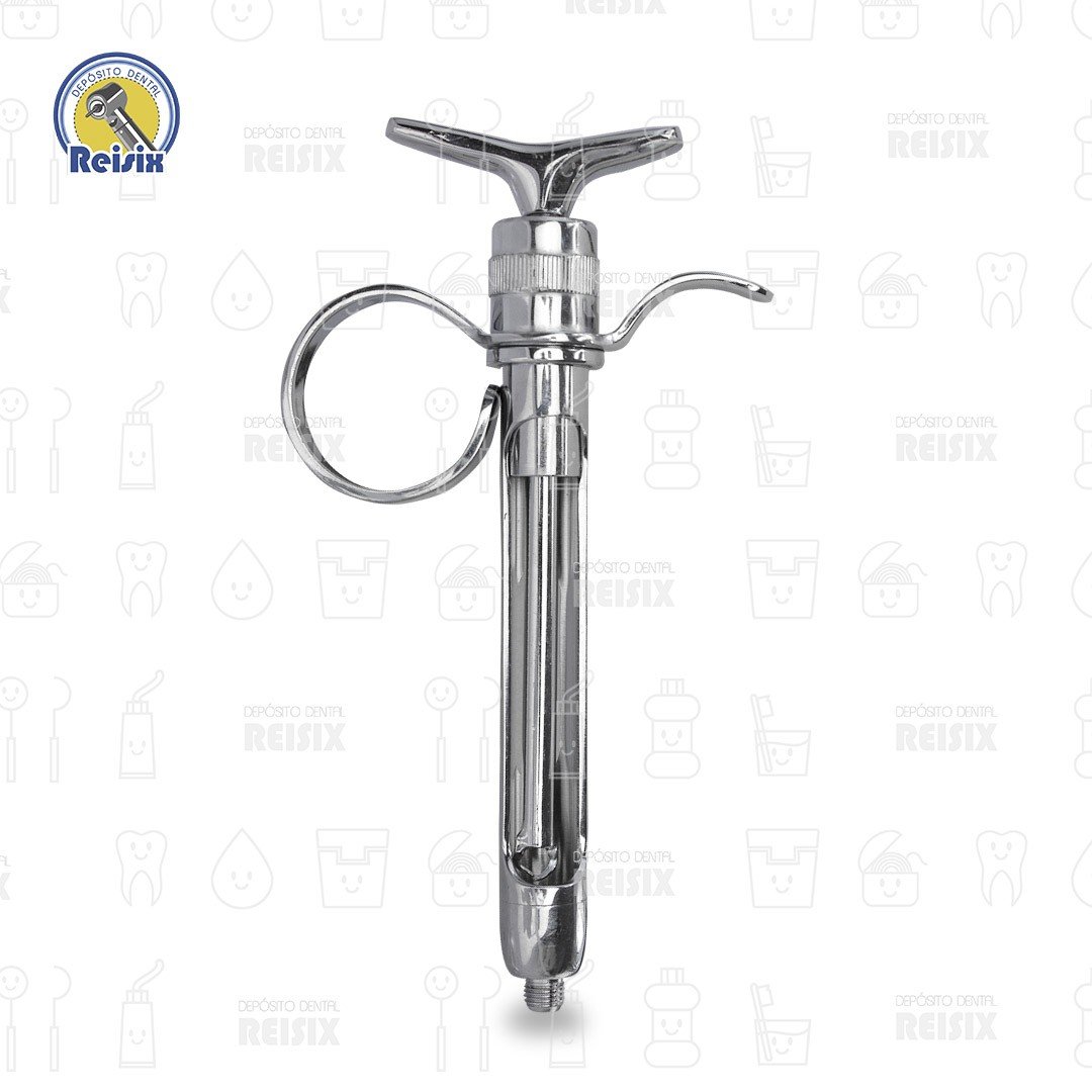 Instrumental fabricado en acero inoxidable de alta calidad, autoclavable, ergonómico, vástago con arpón, sujetador para dedos, anillo para dedo pulgar, barril para el cartucho de anestesia, adaptador para la aguja, destinado a la infiltración de la solución anestésica.