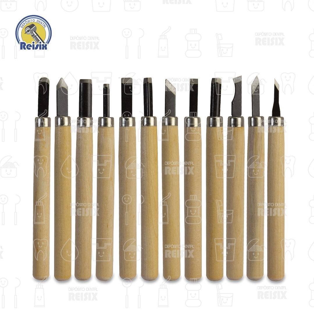 Herramientas manuales de corte, mando de madera con punta activa en diferentes tamaños, auxiliar para el tallado de los macrodientes de yeso, en el tallado de las cavidades, para conocer la preparación ideal de las mismas.