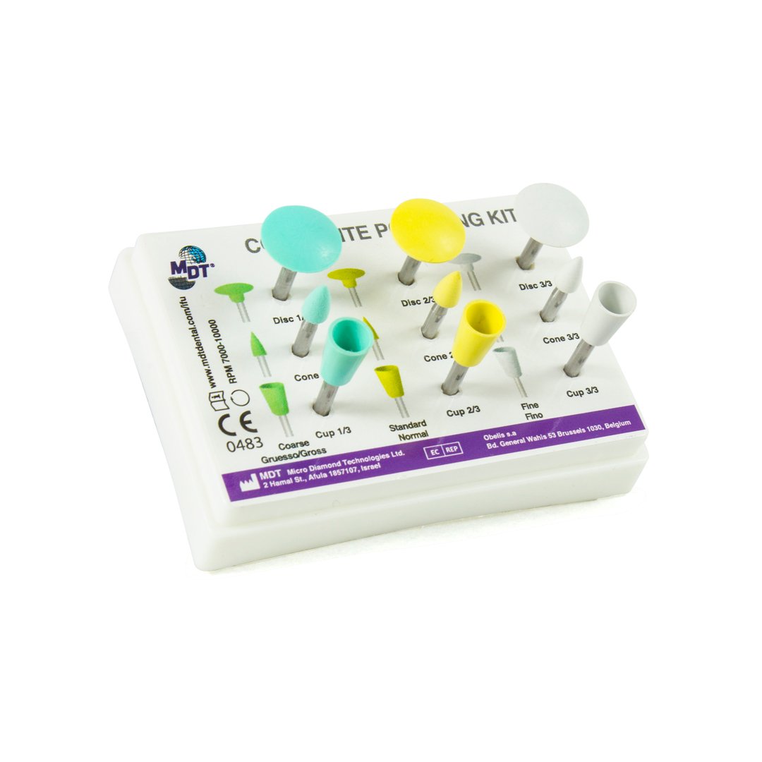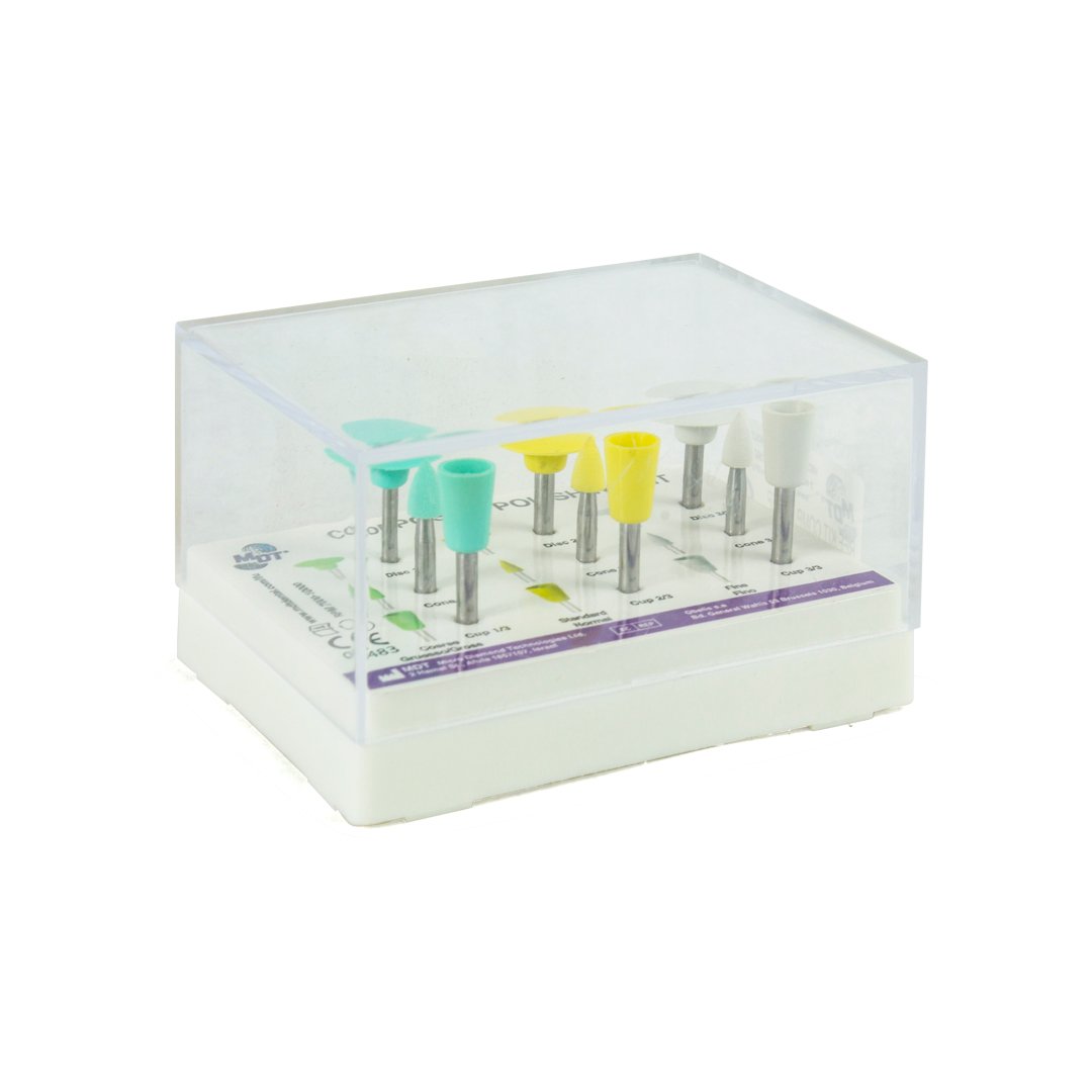 Kit de nueve pulidores para resina MDT se pueden utilizar en metales resinas porcelanas o acrílicos gracias a que están elaborados de silicona y diseñados para su uso con contra ángulo.