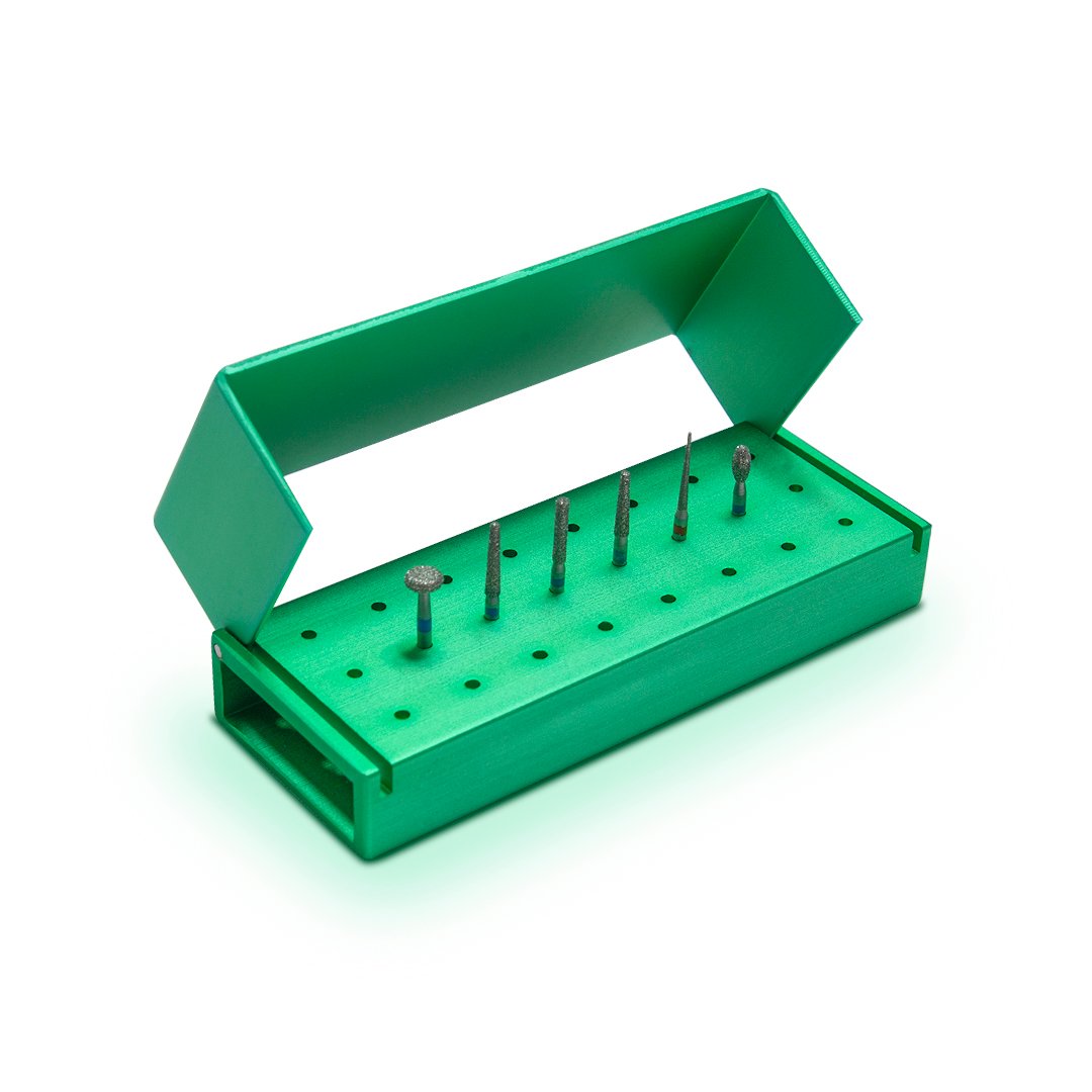 Este kit contiene 6 fresas de diferentes formas utilizadas en procedimientos para prótesis, incluye un fresero metálico autoclavable color verde, para mantenerlas siempre en orden.