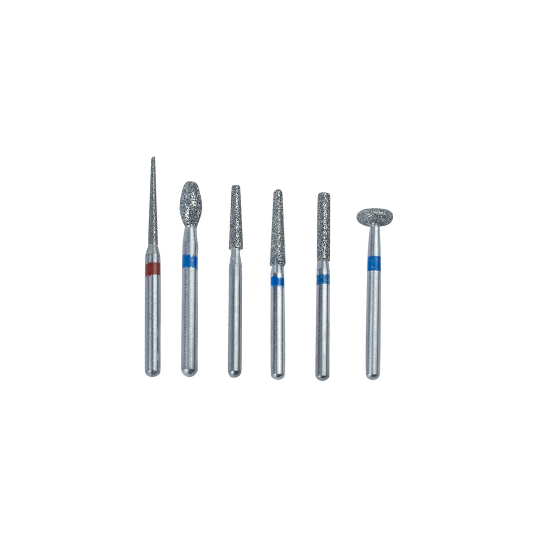 Kit con 6 fresas SS WHITE autoclavables de diferentes formas, ideal para cualquier tratamiento de prótesis.