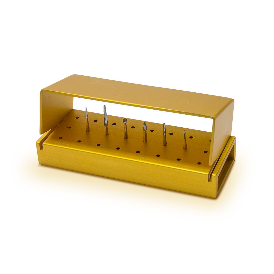 Este kit contiene 6 fresas de diferentes formas, utilizadas en procedimientos para terminado, incluye un fresero metálico autoclavable color dorado, para mantenerlas siempre en orden.