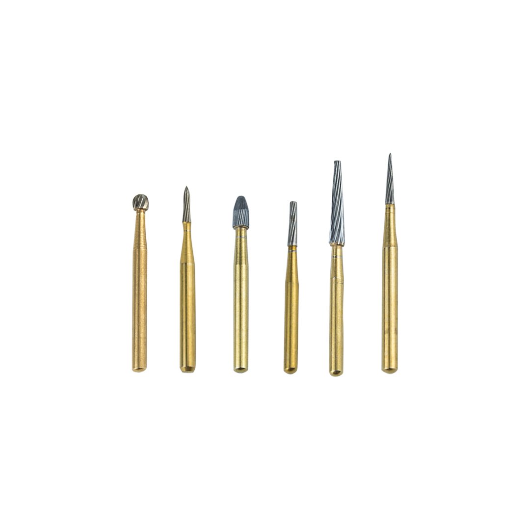 Kit con 6 fresas SS WHITE autoclavables de diferentes formas, ideal para cualquier procedimiento de terminado.