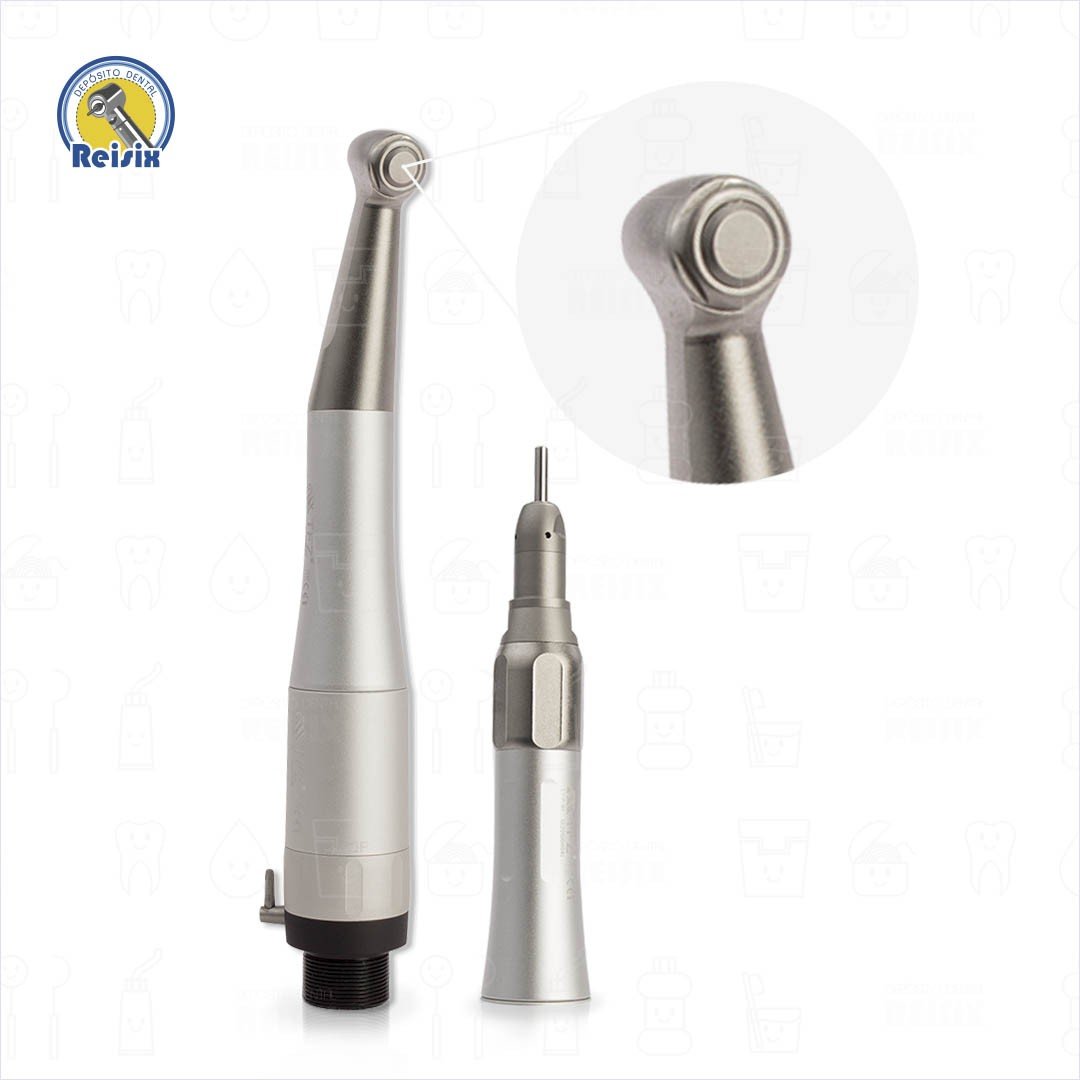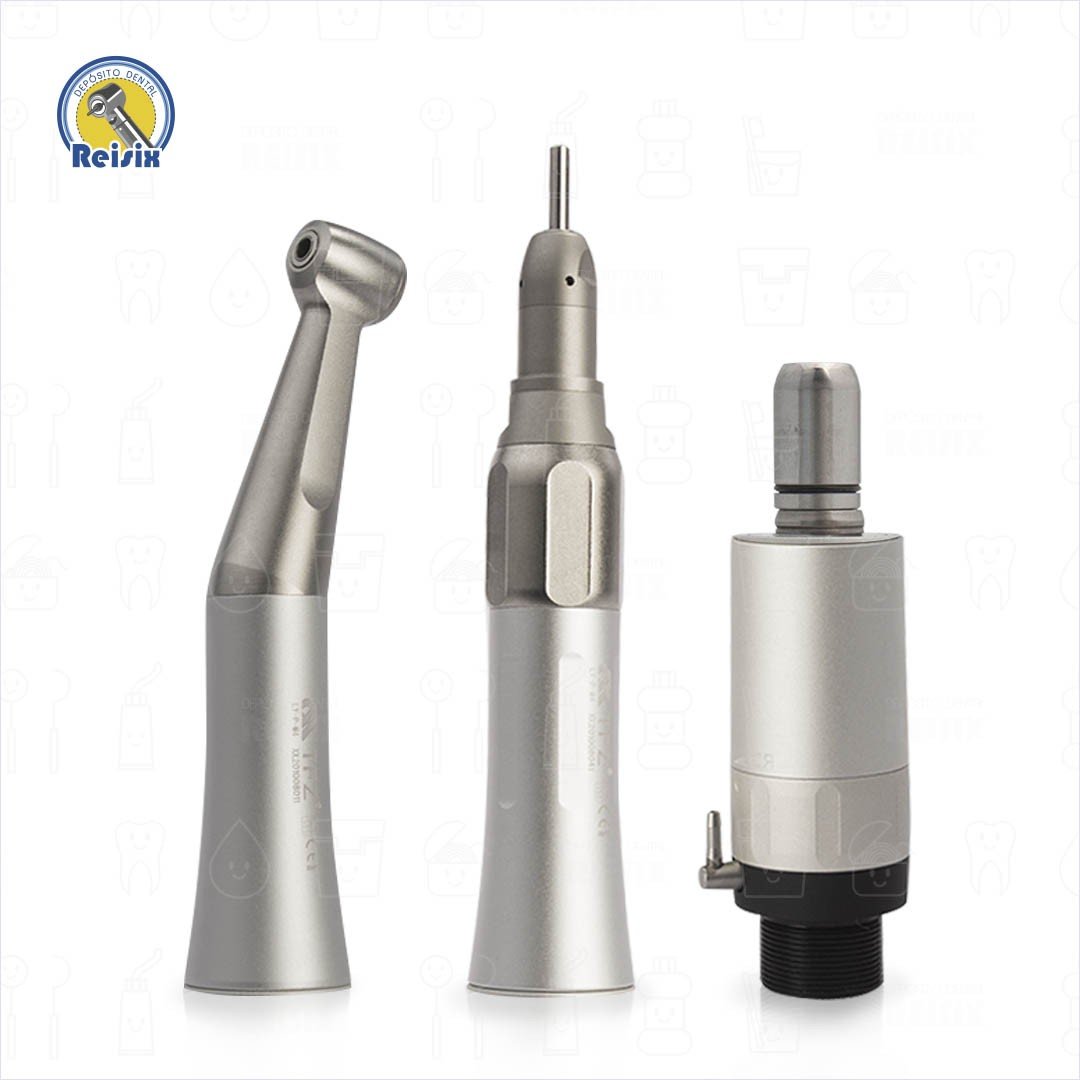 El kit cuenta con un contra ángulo con push button para uso clínico donde se adaptan aditamentos para pulido y el contra ángulo recto se puede colocar a la pieza con entrada tipo E de micromotores para procedimientos quirúrgicos.