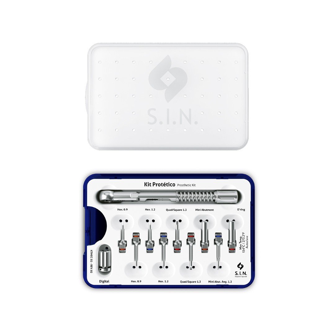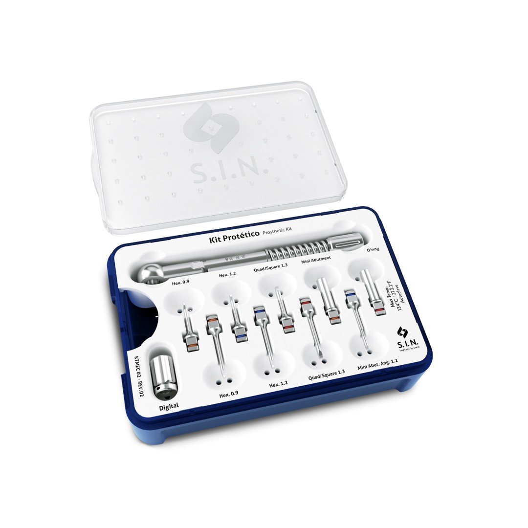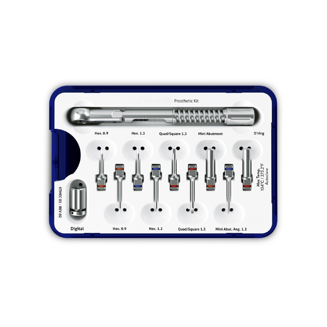 El Kit Protético es un kit compuesto por llaves hexagonales, cuadradas, digitales y anguladas, acompañadas por un torquímetro protético, indicado para fijar y retirar adecuadamente las prótesis y dispositivos protésicos sobre los implantes dentales.