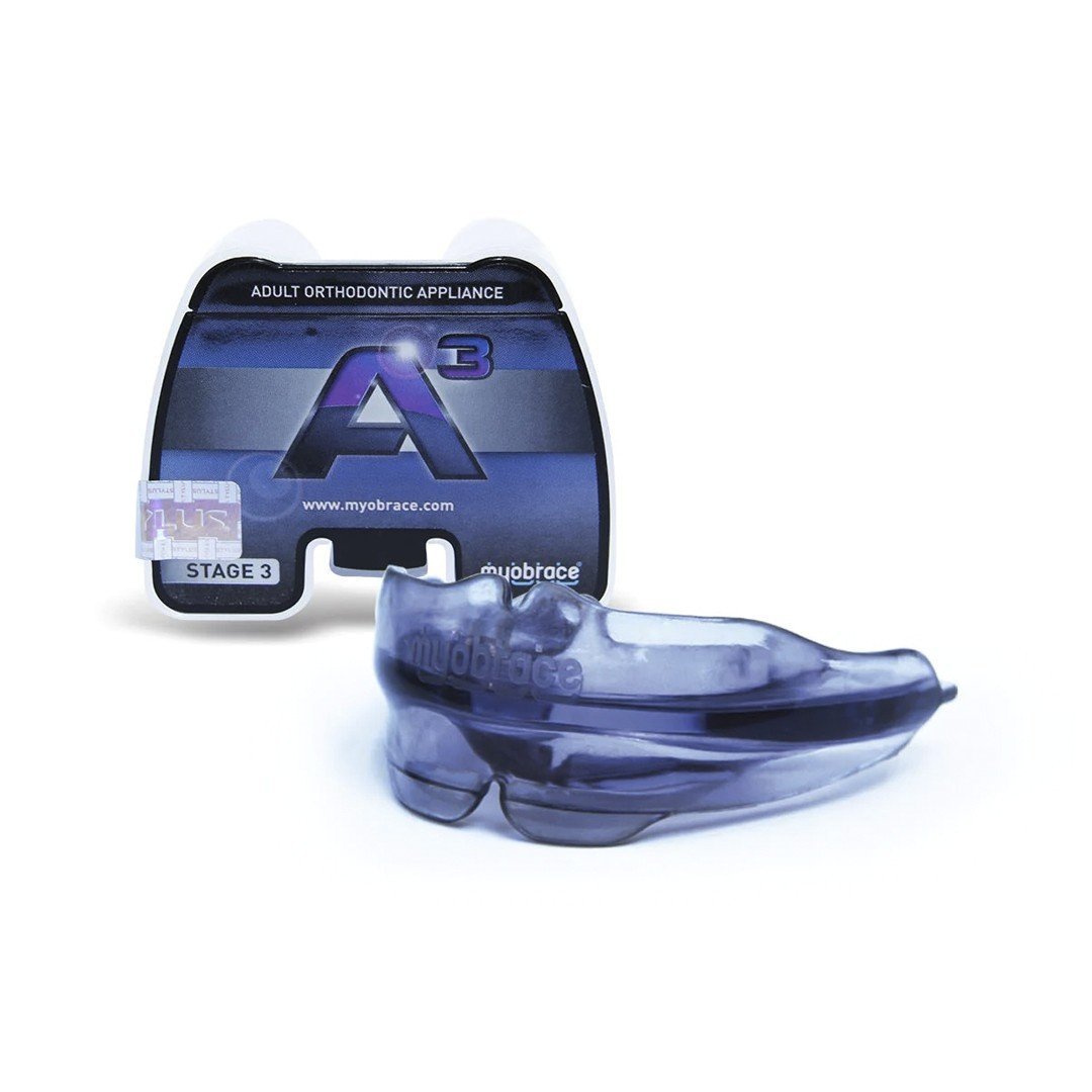El A3 proporciona el alineamiento final y la retención. La lengüeta está perforada, favoreciendo el entrenamiento final de la lengua. El A3 está hecho de poliuretano duro y está indicado para ser el aparato final del sistema de Myobrace para Adulto. Es el indicado para las maloclusiones moderadas en su estado final de alineamiento y de retención.