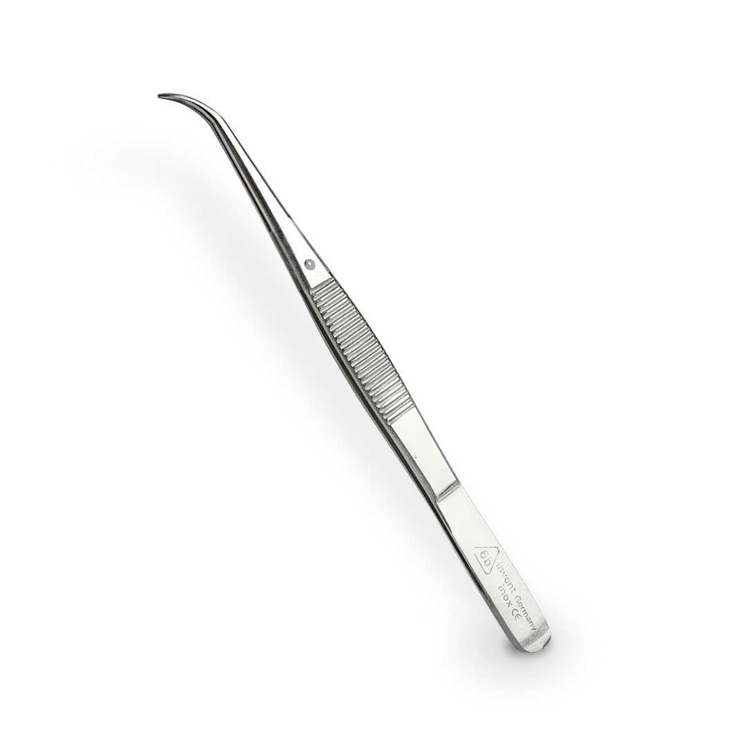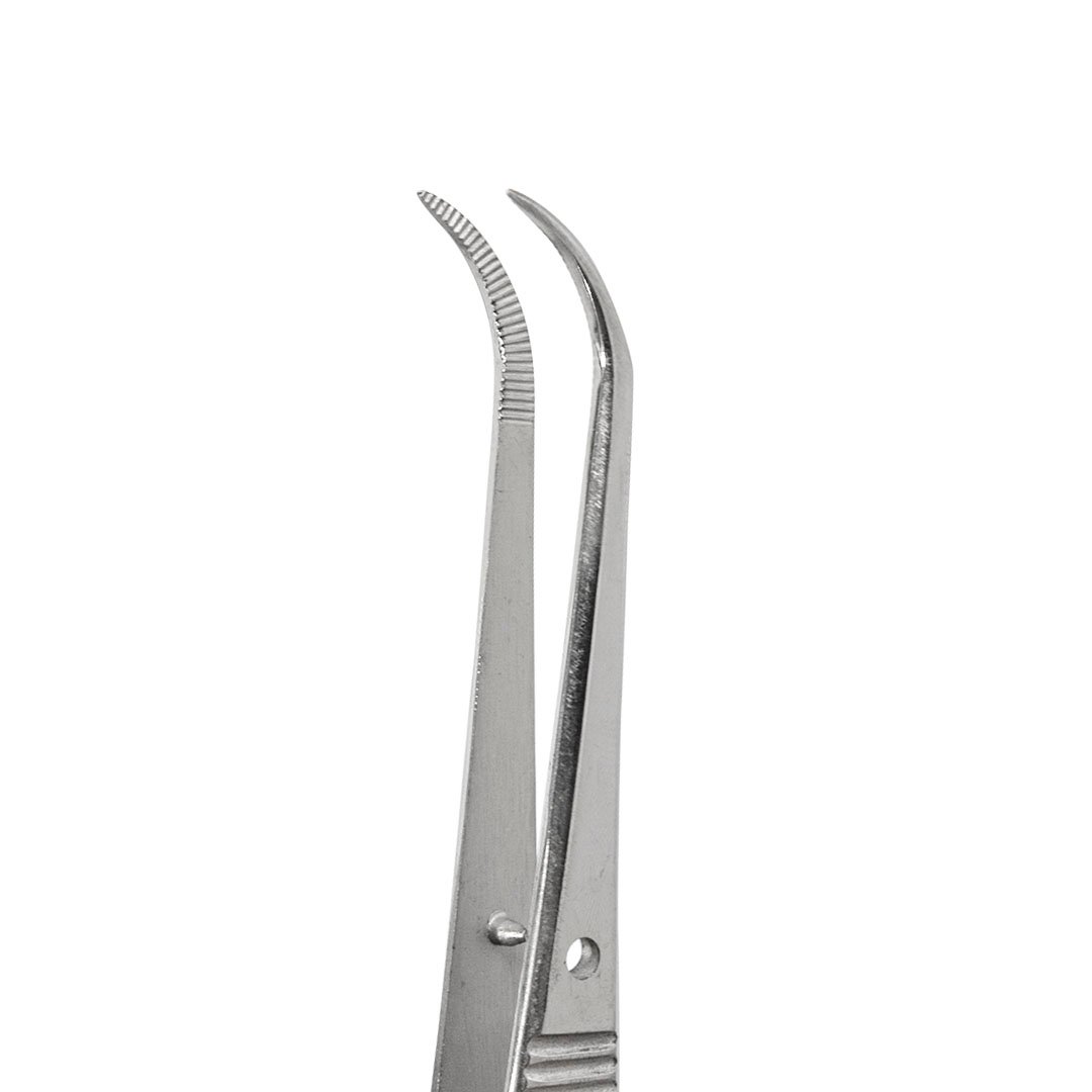 Instrumento fabricado en acero inoxidable de alta calidad, autoclavable, dientes finos en el extremo de cada hoja para sostener o transferir materiales dentro y fuera de la cavidad bucal.