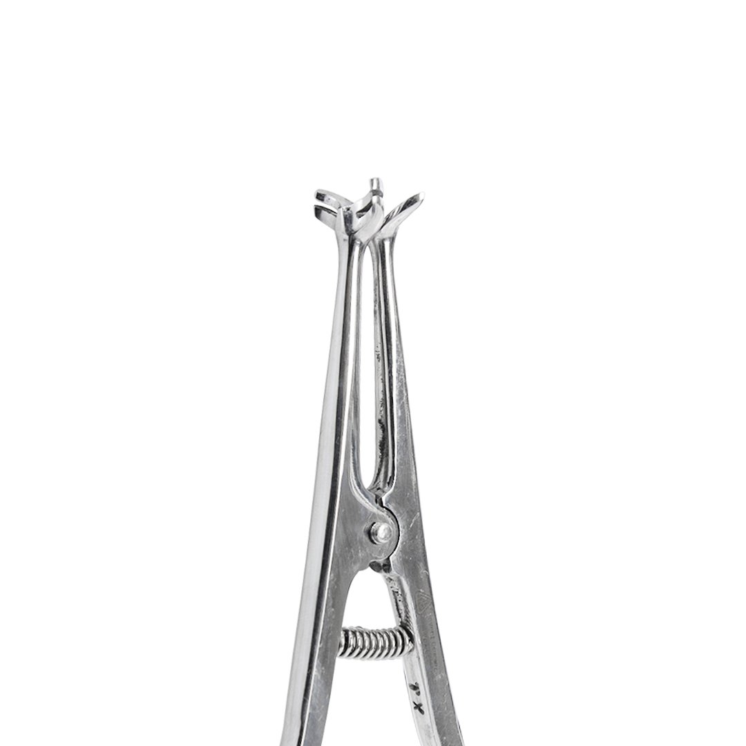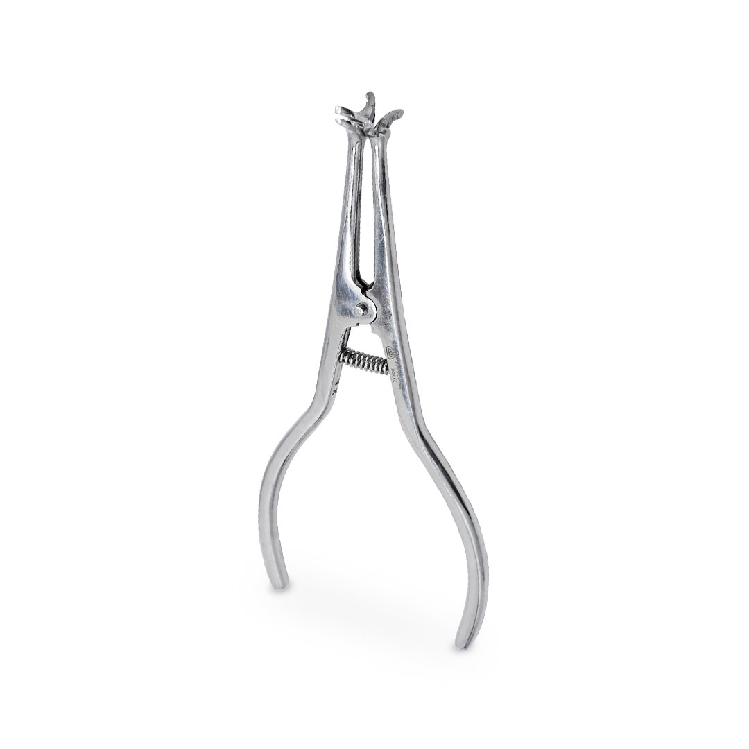 Instrumental fabricado en acero inoxidable, autoclavable, puntas activas acanaladas en forma de riñón, facilita el trabajo de ceñir el extremo de los cables desde un área lingual de difícil acceso.