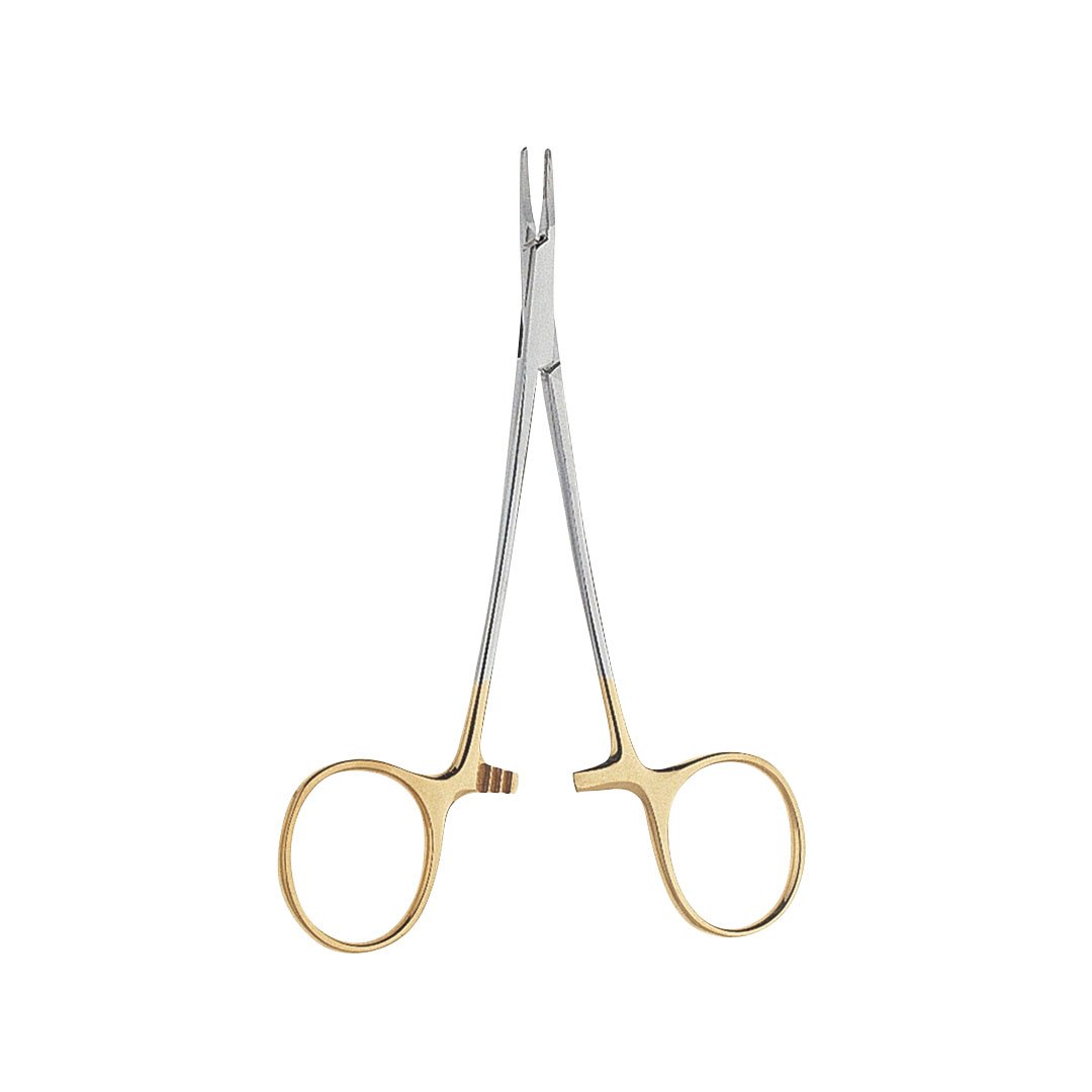 Es un instrumento quirúrgico utilizado para suturar heridas. Es de tamaño mediano y está hecho de carburo de tungsteno, un material resistente al desgaste y a la corrosión. Tiene un mango ergonómico que facilita su manejo.