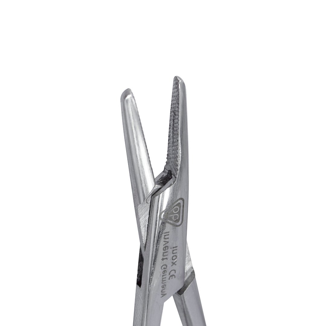 Porta agujas Mayo, es un porta agujas recto con 16 cm de longitud y consiste en un sistema de cierre de tipo cremallera para sujetar la aguja. La pinza tiene concavidades y estrías para que la aguja no se mueva.